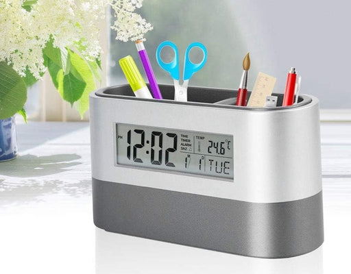 פרקטי: שעון דיגיטלי נוח וחדשני למחזיק עט, הוא לא רק שעון, הוא משלב ארגונית עט שולחנית, מדחום דיגיטלי, מד לחות לחדר, שעון ואזעקה ולוח שנה נצחי.תצו...